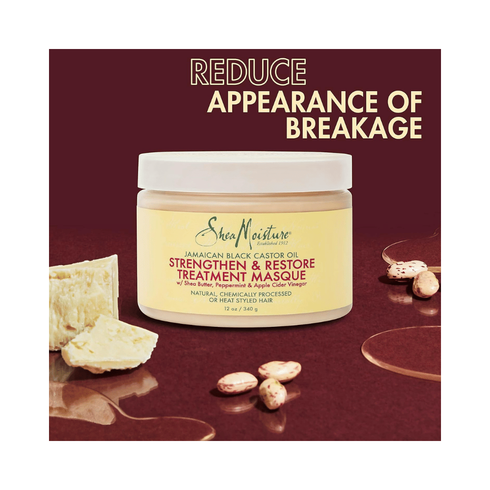 Shea Moisture Jamaican Black Castor Oil Treatment Masque provides deep conditioning to nourish, strengthen, and repair damaged hair.